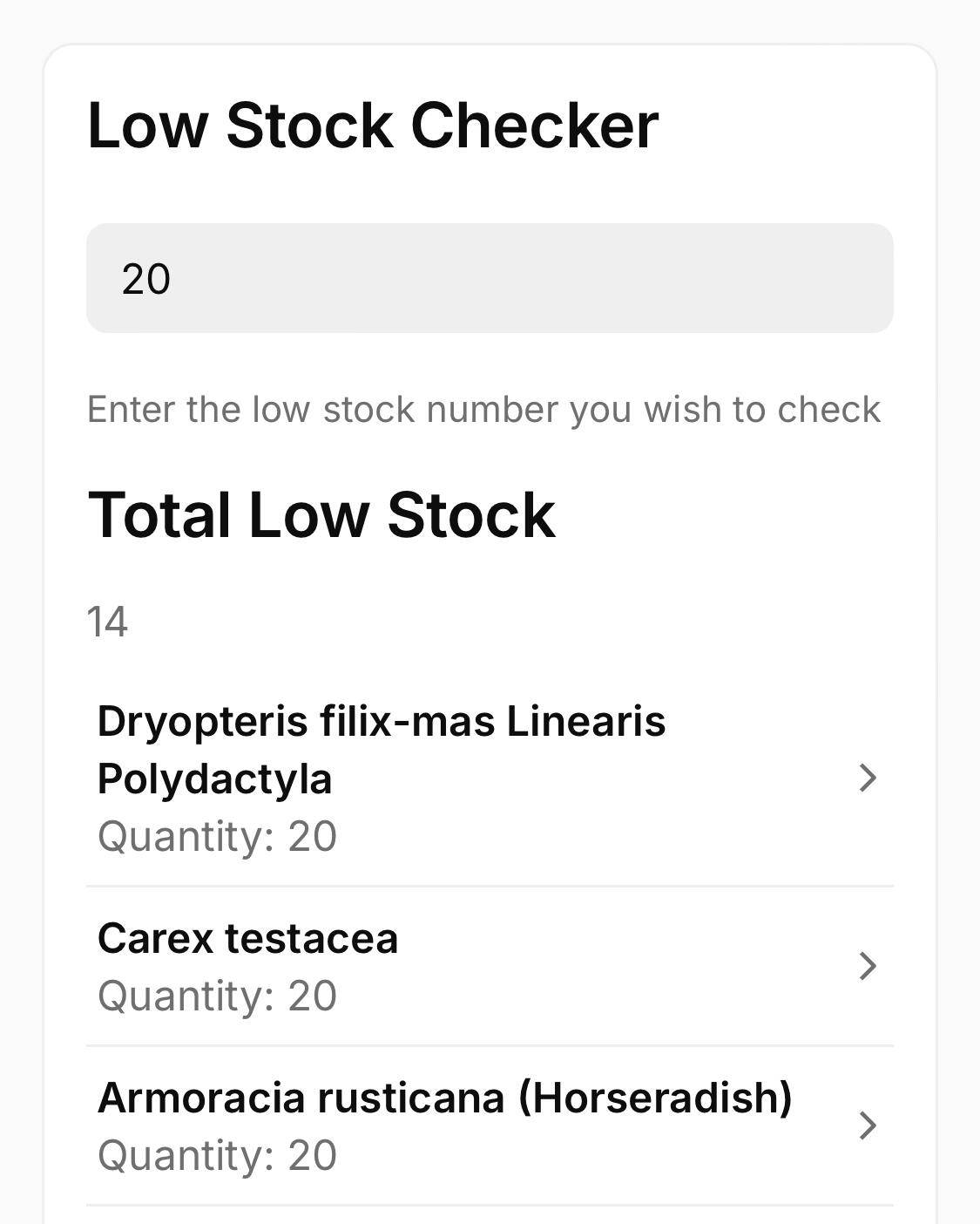 Keep Your Stock List Up to DateTired of juggling spreadsheets, printed lists or handwritten notes? Now you can update your nursery stock in real time, all from one simple place.No More Missed SalesShow customers exactly what’s available, when it’s available. A clear, up-to-date plant list means customers are more likely to buy and less likely to go elsewhere.Works on Phones, Tablets and ComputersWhether you’re in the office or walking the nursery floor, you can update your stock from any device with an internet connection.Reach More Customers, More OftenMake it easy for people to browse your plants online before they visit. Help them plan ahead, get excited, and arrive ready to buy.Built for Nurseries, Not Tech ExpertsThis isn’t generic software. It’s made specifically for UK nurseries simple, visual, and practical for everyday use.