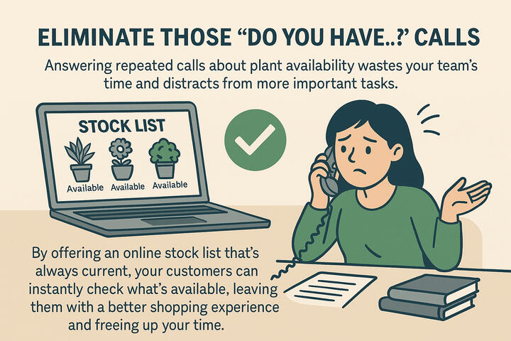 Tired of Customers Finding Out-Of-Date Information?An outdated stock list leads to frustration and confusion.Customers who can’t find accurate information will waste time calling or visiting only to discover the plants they want aren’t available.With a real-time, easily updated list, your customers can always check availability before they visit, saving them time and building their trust in your nursery.Stop Losing Sales to Missed AvailabilityWhen your online stock list isn’t up-to-date, customers can’t see what’s available, which means you lose out on potential sales.But with a live stock list, customers know exactly what’s in store, which helps them plan their purchases ahead of time and reduces the chances of them going elsewhere.Eliminate Those “Do You Have…?” CallsAnswering repeated calls about plant availability wastes your team’s time and distracts from more important tasks.By offering an online stock list that’s always current, your customers can instantly check what’s available, leaving them with a better shopping experience and freeing up your time.Customers Don’t Want to Waste Time Visiting In-PersonWhen a customer arrives expecting to find a specific plant, only to discover it’s out of stock, it’s a missed opportunity for both sides.A real-time plant list helps customers make informed decisions before they visit, reducing disappointment and increasing the likelihood they’ll make a purchase.Make It Easy for Customers to Decide QuicklyCustomers can’t make decisions without the right information. If they can’t find what they need on your website, they may delay their purchase or, worse, go to a competitor.By providing clear, up-to-date details about what’s available, you’re helping customers make quicker purchasing decisions, which means more sales for you.No More Inconsistent Information Across PlatformsManaging stock across different channels like social media, PDFs, and websites can lead to errors and confusion.With everything in one place, your customers will always see the same, accurate stock information no matter where they look, streamlining their experience and making it easier for them to shop.Don’t Let Competitors Steal Your CustomersWhen your stock isn’t available online, potential buyers will turn to competitors who offer a better digital experience.With a real-time, easily accessible stock list, you’re making it easier for customers to choose your nursery over others, ensuring you don’t lose them to competitors.