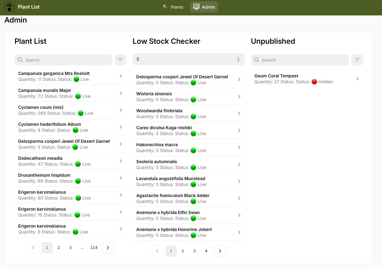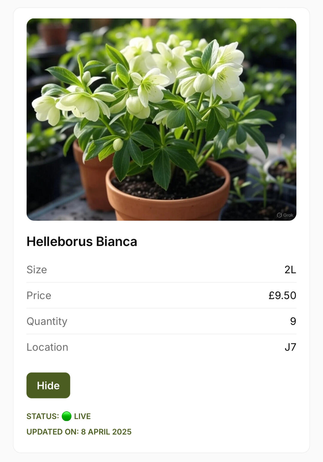 Keep Your Stock List Up to DateTired of juggling spreadsheets, printed lists or handwritten notes? Now you can update your nursery stock in real time, all from one simple place.No More Missed SalesShow customers exactly what’s available, when it’s available. A clear, up-to-date plant list means customers are more likely to buy and less likely to go elsewhere.Works on Phones, Tablets and ComputersWhether you’re in the office or walking the nursery floor, you can update your stock from any device with an internet connection.Reach More Customers, More OftenMake it easy for people to browse your plants online before they visit. Help them plan ahead, get excited, and arrive ready to buy.Built for Nurseries, Not Tech ExpertsThis isn’t generic software. It’s made specifically for UK nurseries simple, visual, and practical for everyday use.
