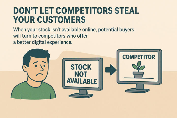 Tired of Customers Finding Out-Of-Date Information?An outdated stock list leads to frustration and confusion.Customers who can’t find accurate information will waste time calling or visiting only to discover the plants they want aren’t available.With a real-time, easily updated list, your customers can always check availability before they visit, saving them time and building their trust in your nursery.Stop Losing Sales to Missed AvailabilityWhen your online stock list isn’t up-to-date, customers can’t see what’s available, which means you lose out on potential sales.But with a live stock list, customers know exactly what’s in store, which helps them plan their purchases ahead of time and reduces the chances of them going elsewhere.Eliminate Those “Do You Have…?” CallsAnswering repeated calls about plant availability wastes your team’s time and distracts from more important tasks.By offering an online stock list that’s always current, your customers can instantly check what’s available, leaving them with a better shopping experience and freeing up your time.Customers Don’t Want to Waste Time Visiting In-PersonWhen a customer arrives expecting to find a specific plant, only to discover it’s out of stock, it’s a missed opportunity for both sides.A real-time plant list helps customers make informed decisions before they visit, reducing disappointment and increasing the likelihood they’ll make a purchase.Make It Easy for Customers to Decide QuicklyCustomers can’t make decisions without the right information. If they can’t find what they need on your website, they may delay their purchase or, worse, go to a competitor.By providing clear, up-to-date details about what’s available, you’re helping customers make quicker purchasing decisions, which means more sales for you.No More Inconsistent Information Across PlatformsManaging stock across different channels like social media, PDFs, and websites can lead to errors and confusion.With everything in one place, your customers will always see the same, accurate stock information no matter where they look, streamlining their experience and making it easier for them to shop.Don’t Let Competitors Steal Your CustomersWhen your stock isn’t available online, potential buyers will turn to competitors who offer a better digital experience.With a real-time, easily accessible stock list, you’re making it easier for customers to choose your nursery over others, ensuring you don’t lose them to competitors.
